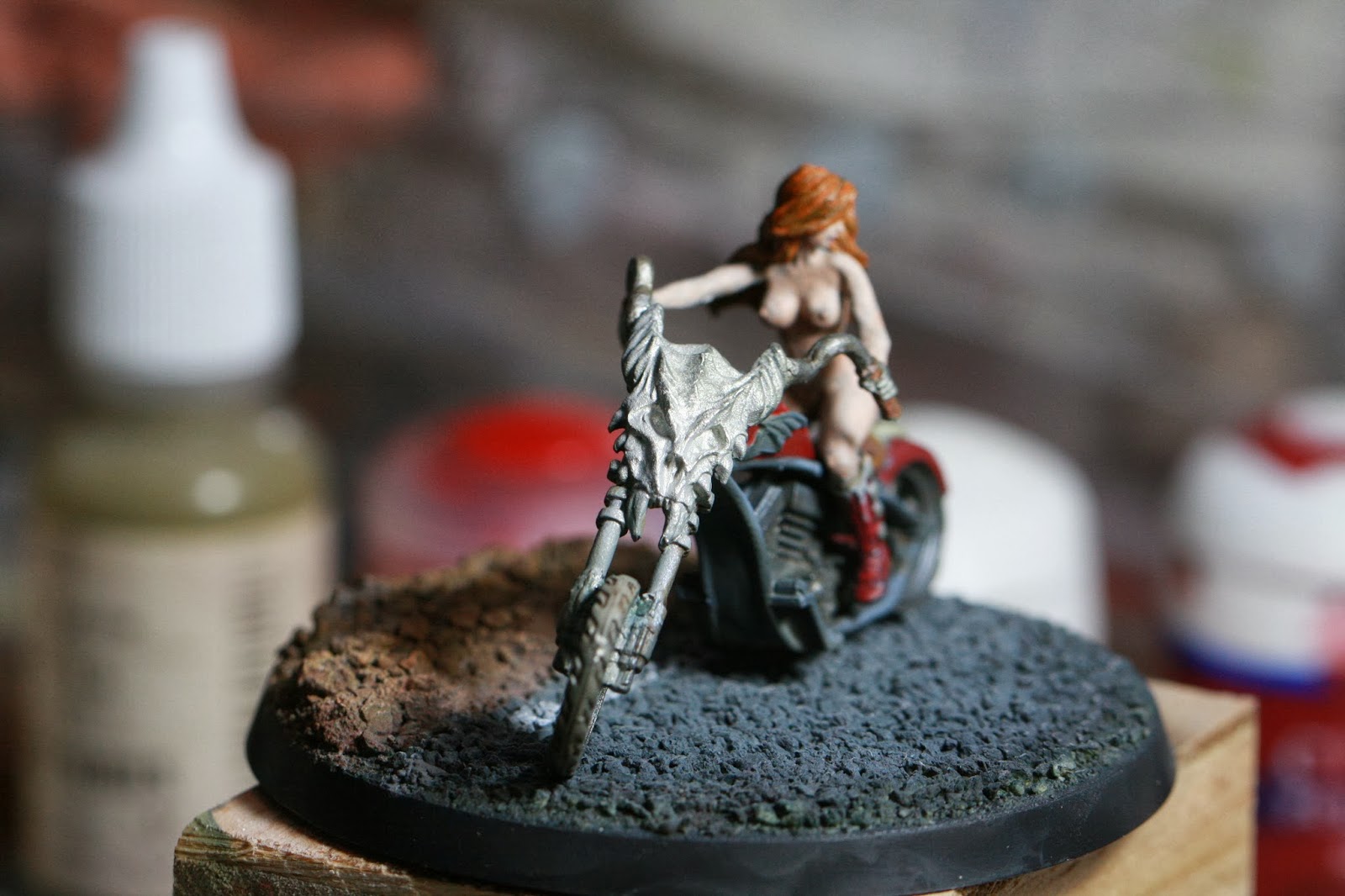 One lesson I learned and took to heart is that always try putting the parts and the mini to the base before painting, remember how they should fit together before painting them. The most important thing about Sophie here is that her bottom doesn't touch the seat, and the belly of the bike doesn't touch the base. Therefore the bike is lifted by the front wheel of the bike and her right leg.